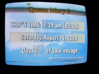 No, I’m not up at 2am taking pictures of our TV screen. This was the time the QM2 stopped. So its 7am now and we are still where we were 5 hours ago, 721.3 nautical miles from Southampton. At least the power is back on now, its a bit dark otherwise with just the emergency lighting.